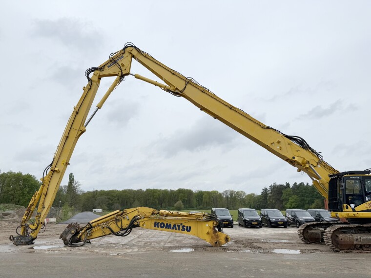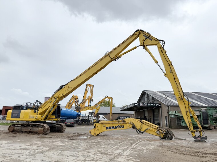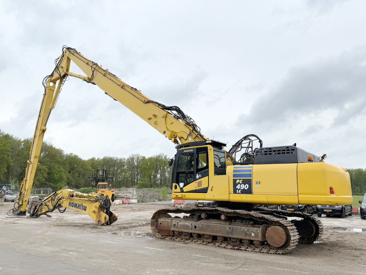 Disponibil din stoc la Boss Machinery! Această Komatsu PC490LC-10 UHD - 29 Meter Demolition Excavator pe șenile din 2016 are o putere a motorului de 270 kW și 7670 ore de funcționare.